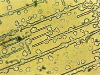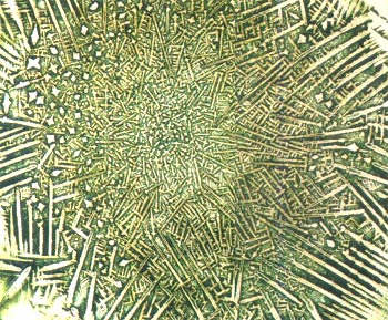 dünne, schnurgerade Kristallstäbchen sind in die Blutprobe „hineingewachsen",
